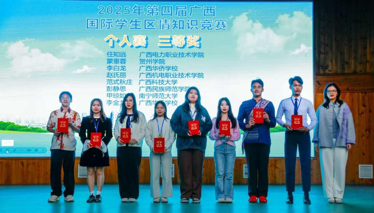 为丰富国际学生的校园生活,增进其对中国的国情、区情与时事的了解,提升对广西及中国的认同感与热爱,培养更多知华友华的国际人才,广西高等教育学会外国留学生教育管理专业委员会于2025年11月27日至28日,在柳州城市职业学院成功举办了主题为“国际学生看美丽广西”的第四届广西国际学生区情知识竞赛。本届赛事由柳州城市职业学院国际教育学院承办,吸引了区内众多高校的国际学生同台竞技。我校选派的三名优秀国际学生—甲琼如、黄氏庄和孙凤萍在比赛中表现卓越,尤其在团体赛中力拔头筹,荣获一等奖,为学校赢得了荣誉。