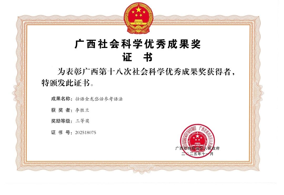 近日,广西壮族自治区人民政府公布了第十八次社会科学优秀成果奖获奖名单。我院李胜兰副教授的学术专著《壮语金龙岱话参考语法》荣获专著类三等奖。这一奖项是对李胜兰副教授潜心学术研究、深耕民族语言文化领域所取得成果的高度认可,也彰显了我校在语言学、民族学研究方面的扎实功底和积极贡献。