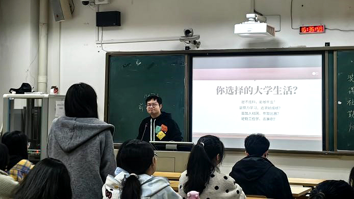 “大学不是单行道,而是一片可以自由探索的森林。”曹钰涵结合自身经历,生动诠释了“多元化发展”的内涵。随后,他又围绕“你选择的大学生活?”这一主题,通过PPT展示和互动提问,引导新生明确大学目标,树立积极心态,合理规划时间,平衡学习与工作。他强调,“专业学习是根基,但社团活动培养软技能,竞赛锤炼抗压与协作能力,实践积累社会认知——它们相互支撑,让大家在面对未来挑战时更有底气。”