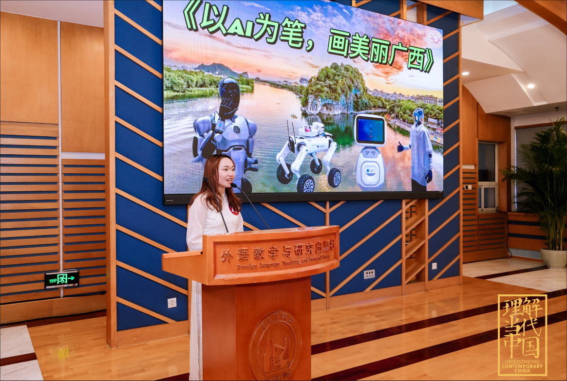 《以AI为笔,画美丽广西》以留学生第一人称视角,从传统与现代交融点切入,生动呈现了广西在人工智能领域的蓬勃发展。作品通过“发展的中国”“温度的中国”“共同未来的中国”三个层次,层层递进,既展现了中国—东盟博览会上令人惊叹的工业机器人,也捕捉了校园图书馆中温暖的AI朗读厅等场景,诠释了科技如何赋能社会、服务民生,并表达了留学生愿成为中外文化交流桥梁的愿景。