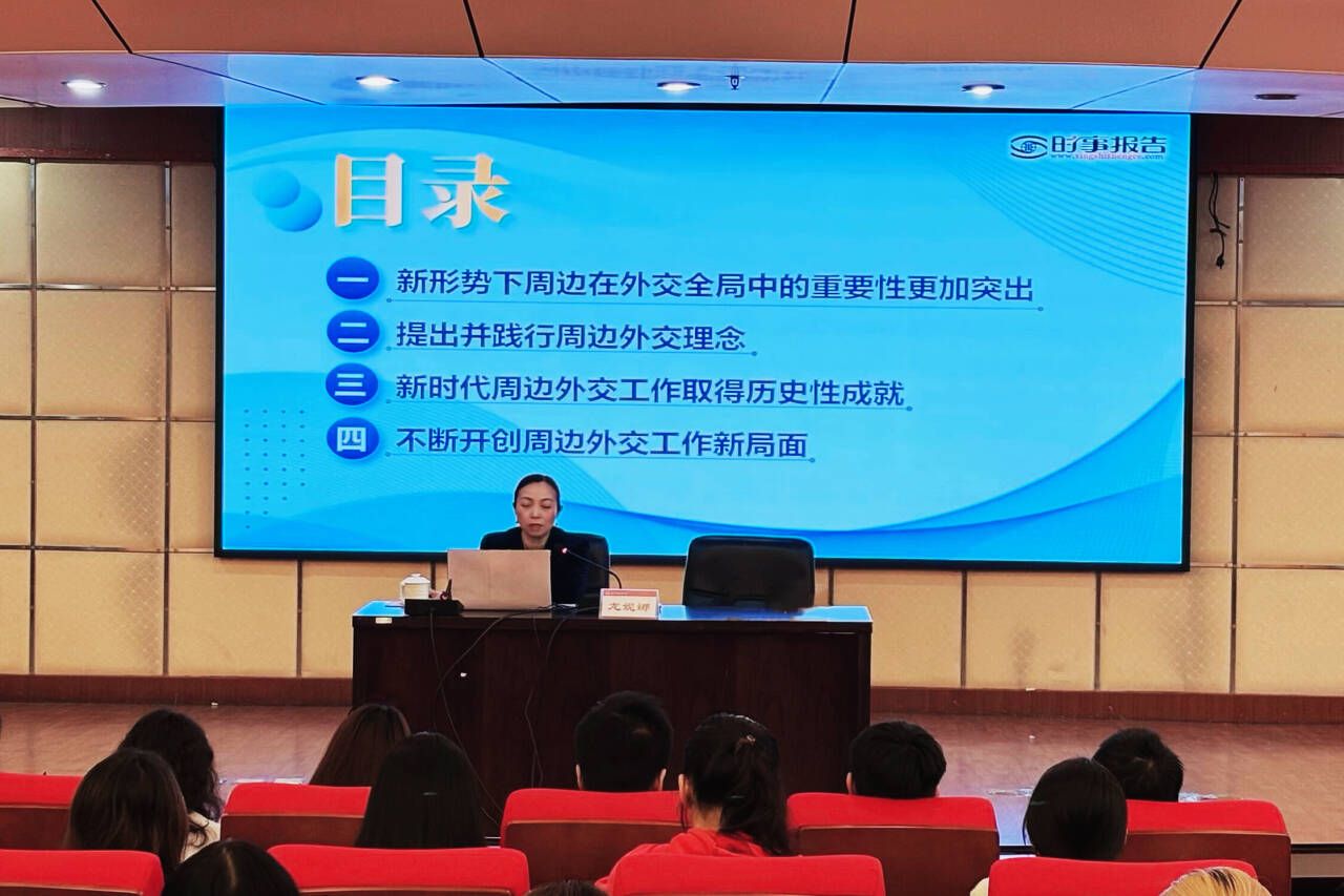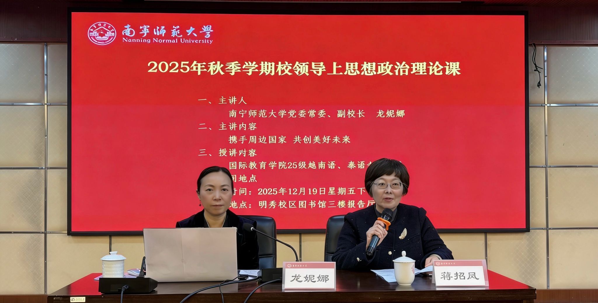 12月19日下午,学校党委常委、副校长龙妮娜以《携手周边国家 共创美好未来》为题,在明秀校区图书馆报告厅为国际教育学院2025级越南语、泰语专业学生讲授《形势与政策》课。